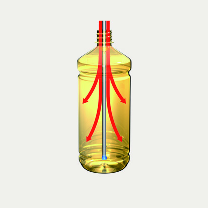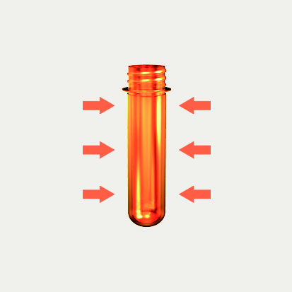 - Enjeksiyon işleminden sonra preformlar, çene kalıbı vasıtasıyla diğer istasyonlara taşınır. Şişirme işlemi boyunca preformların çene veya gövde bölgeleri birbirlerine temasta bulunmadıkları için, 2-Kademeli üretimin genel sorunları olan çizik veya lekelenmelere asla rastlanmaz. Bu arada, preformlar da makinenin dışına çıkmadıkları için yüksek hijyen oranı da muhafaza edilmiş olur.