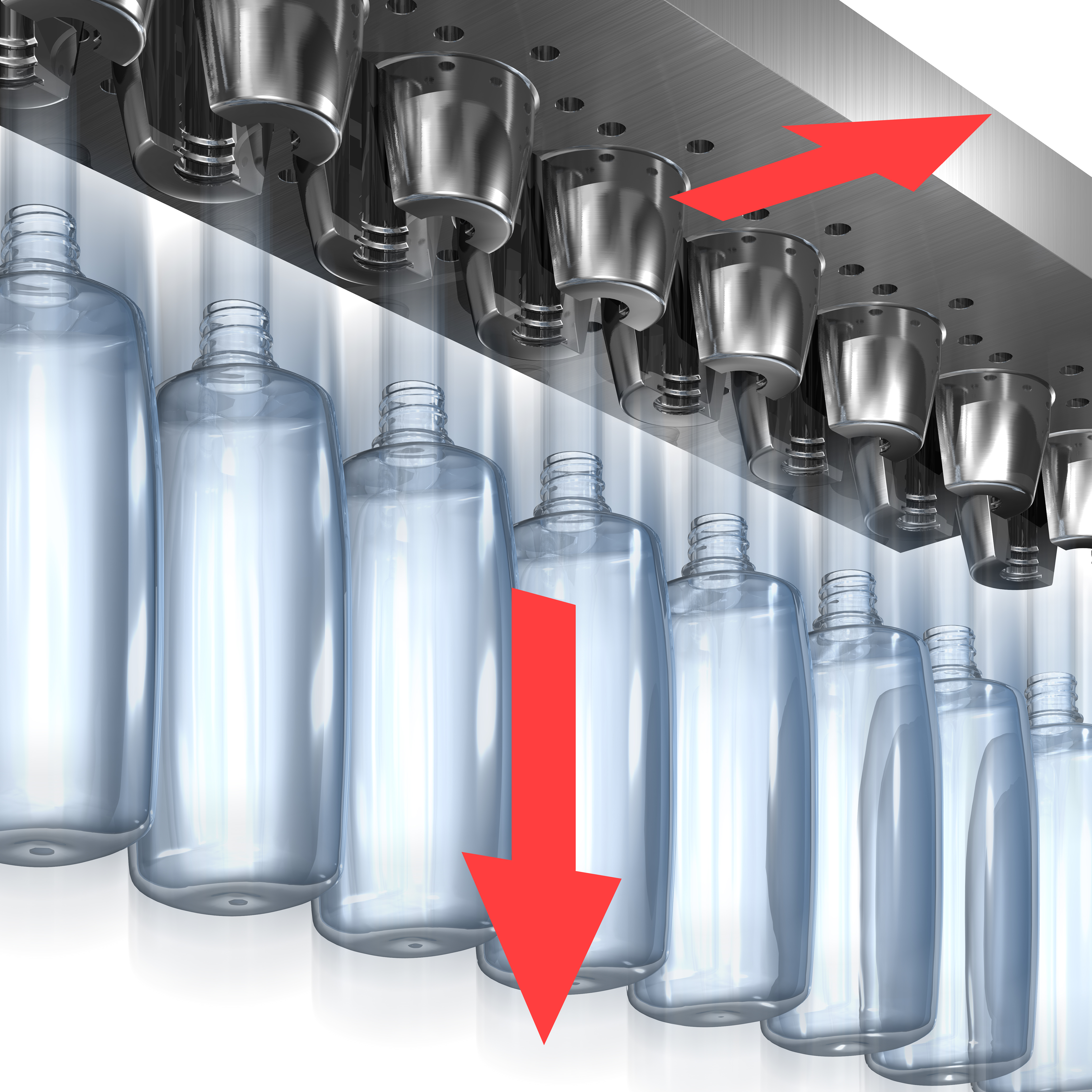 Üretilen şişe, preformun enjeksiyonundan beri hassas olarak içinde kaldığı çene kalıplarından ya direkt olarak tahliye edilir ya da ürün tahliye robotu ile konveyöre aktarılır. Ağızlar tüm proses boyunca çizilme ve hasardan korunacak şekilde ve yönü gövdeye sabit olarak tutulmaktadır. 1- Kademe makineler aynı şekilde şişenin kendisini de çizilmekten korumakta, böylelikle özel yüksek kalite görsellik ihtiyacı olan şişeler için de ideal çözüm olmaktadır.