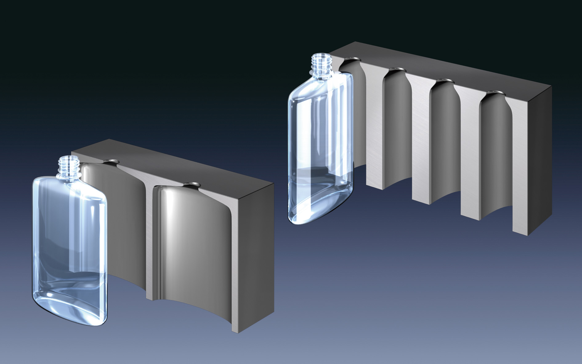 ASB’nin yüksek kaliteli şişirme kalıbı üretim kabiliyeti sayesinde, karmaşık şişe şekillerinin üretilebilmesi için kalıplar, normal açılım düzleminden farklı olarak da tasarlanabilir. (ASB / PF Serilerinde)